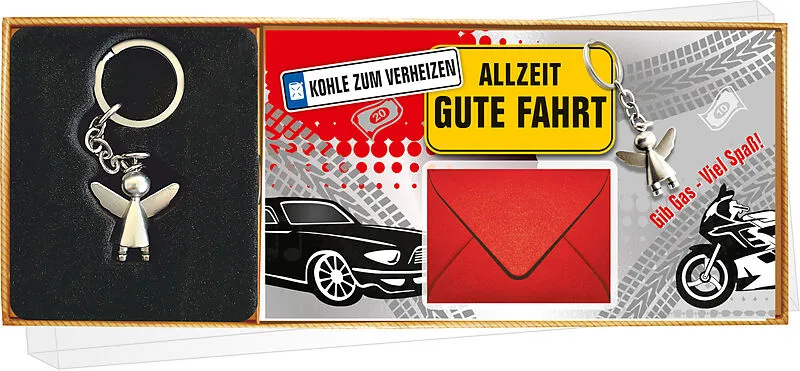 Die Geschenkbox mit einem Schlüsselanhänger Schutzengel und einer Glückwunschkarte mit Geldcouvert Geschenkbox ist mit einem Klarsichtdeckel versehen Ideal als Glücksbringer für eine Fahrprüfung oder zum 18. Geburtstag