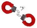 Metallhandschellen mit rotem Plüsch. Die Verpackung enthält Handschellen und 2 Schlüssel.