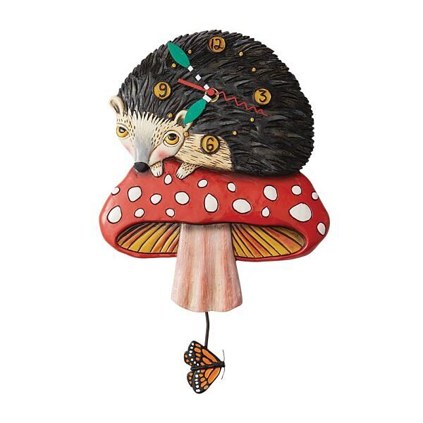 Igel-Wanduhr sitzt auf einem leuchtend roten Pilz mit einem schmetterlingsartigen Pendel. Ideal für diejenigen, die die Natur und Gartenarbeit lieben. Allen Designs ist eine Kollektion, deren Ziel es ist, den Menschen durch kreative, hochwertige und funktional...