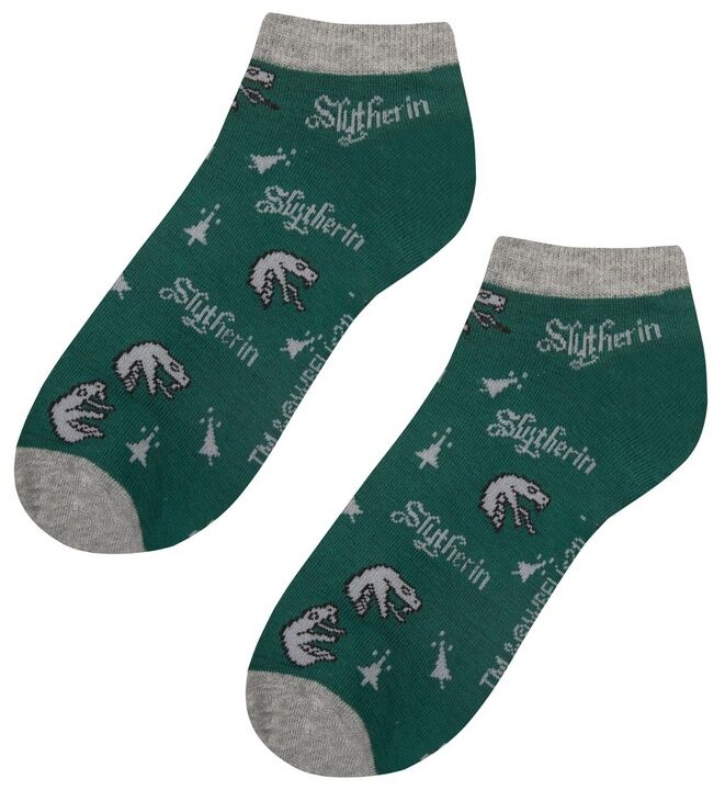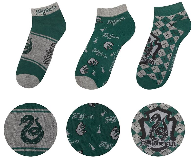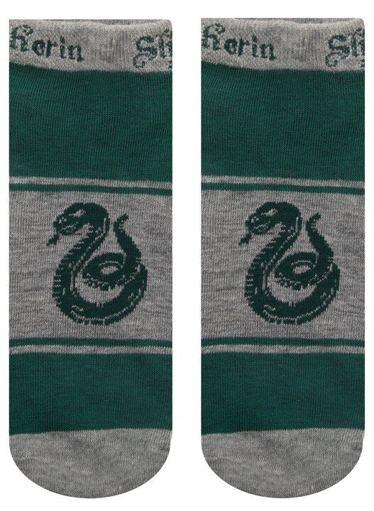Diese 3 Paar Socken mit Slytherin-Emblemen und den erkennbaren grünen und grauen Farben sind perfekt für jeden Hogwarts-Liebhaber. Die Socken lassen sich leicht unter deinen Schuhen verstecken und begleiten dich nach draussen oder sind dein bester Freund für e...