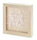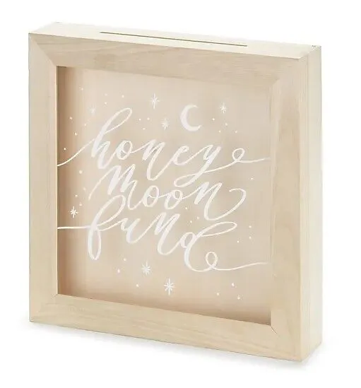 Spardose aus Holz mit weißer Aufschrift Honeymoon fund, auf Plexiglas gedruckt, Maße ca. 6 x 30 x 30 cm.