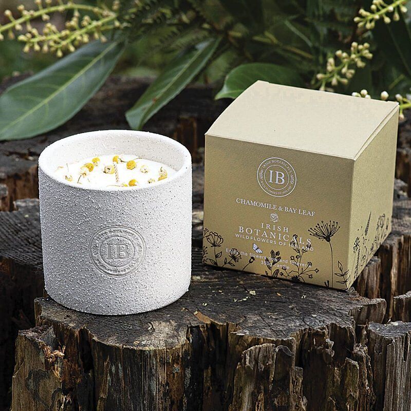 Irish Botanicals Kamille- und Lorbeerblatt-Kerze eine Mischung aus beruhigendem Kamillenduft und belebendem Lorbeerblatt. Diese Premium-Kerze zeugt von hochwertiger Handwerkskunst. ca. 10cm