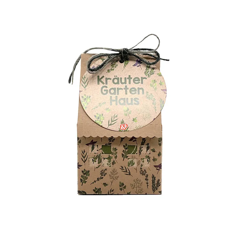 Kleines Kräutergartenset mit verschiedenen Kräutern zum Aussäen. In den ökologischen Pflanztüten lassen sich die Samen gut auf der Fensterbank aussäen und dann später mit dem Pflanztopf ins Beet, Balkonkasten oder in einen Kübel auspflanzen. Das Haus besteht a...