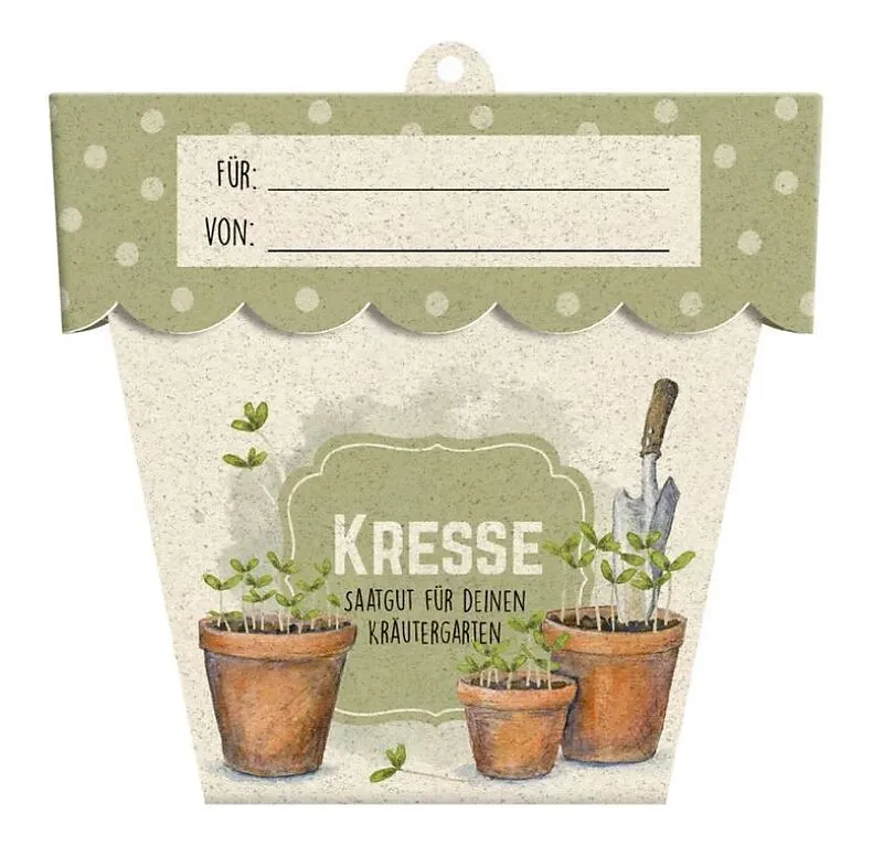 Mäppchen aus Graspapier mit Saatmischung, Mini-Pflanzenstecker und Platz für Grüsse