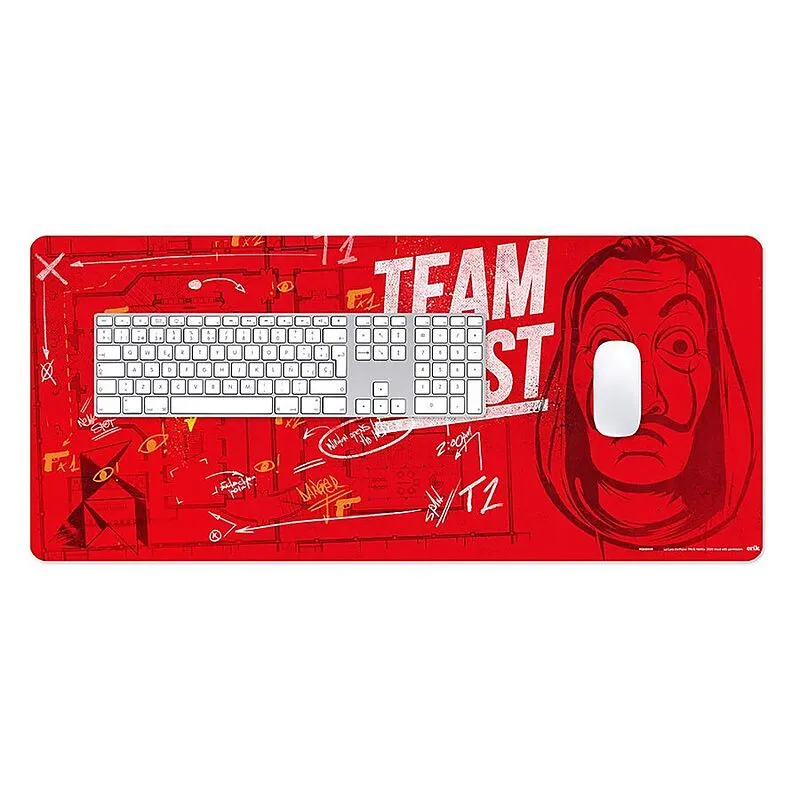Design: Offiziell lizenzierter La Casa De Papel Artikel Motiv: "Team Heist" Masse: ca. 80 x 35 x 0,4 cm Material: Oberfläche 100 % Polyester, Unterseite aus Naturkautschuk Farbe: rot/weiss/gelb Details: rutschfeste Unterseite, als Unterlage für Tastatur und Ma...