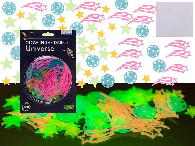 leuchten im Dunkeln 100 kleine leuchtende Sterne,Planeten,Meteore, etc. in der Grösse von ca. 4 -7 cm, die du an die Scheibe oder Wand kleben kannst und du fühlst dich in deinem Zimmer wie im Universum, wenn diese im Dunkeln leuchten! Spannend und faszinierend...