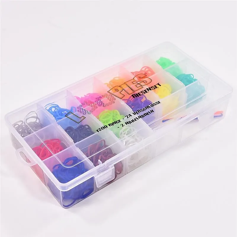 Großes Set an Loopies mit diversen Zubehörteilen in einer Box mit Fächern. Das Set beinhaltet: -1200 Gummibänder (in 15 Farben) -24 Verschlüsse -2 Häkelnadeln Dieses Set beinhaltet alles, was Kinderherzen höher schlagen lässt. Material TPR (frei von Latex) 1 S...