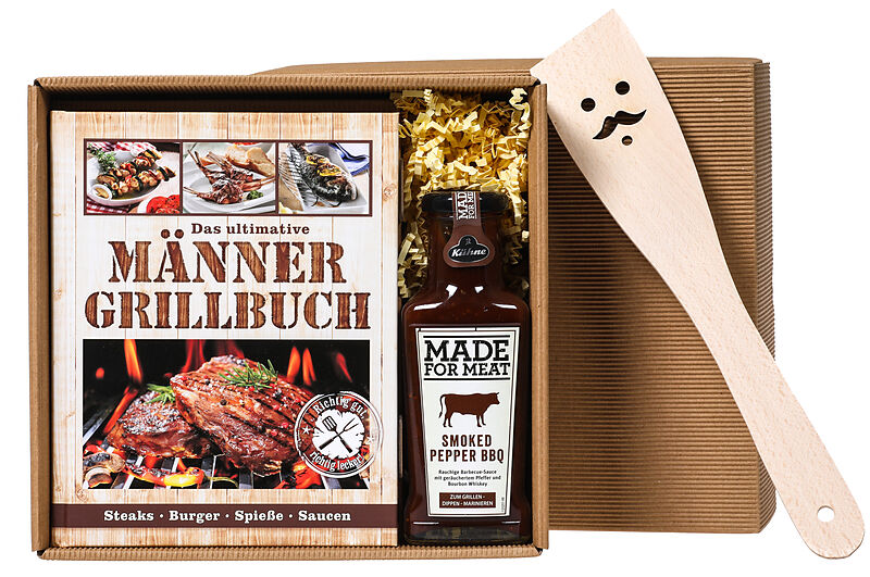 Ein originelles Männer-Geschenkset. Beinhaltet das beliebte Männer-Grillbuch, eine Grillsauce und einen lustigen Holzwender. (Grillsauce kann von Abbildung abweichen.)