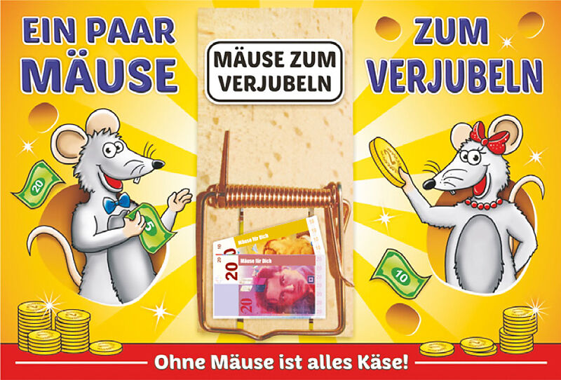 Die Mausefalle ist ein optimales Geldgeschenk. Das Nötli kann in die Mäusefalle eingeklemmt werden. Diese ist auf der Glückwunsch- Doppelkarte angebracht.
