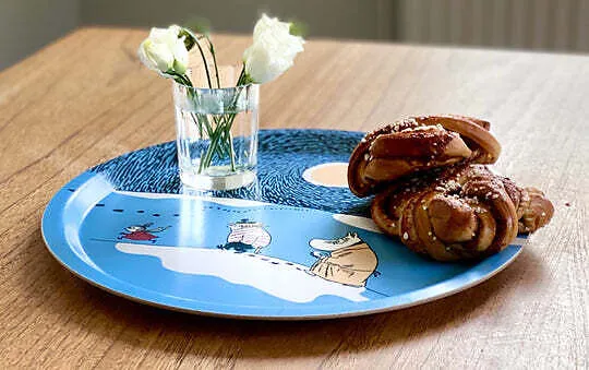 Ein rundes Tablett mit einem Durchmesser von Ø 31 cm, mit einem wunderschönen Motiv, inspiriert von Tove Janssons Originalzeichnungen. Es ist von hoher Qualität und wird in Schweden aus Birkenholz handgefertigt. Spülmaschinenfest. Ein Motiv, inspiriert von Tov...