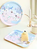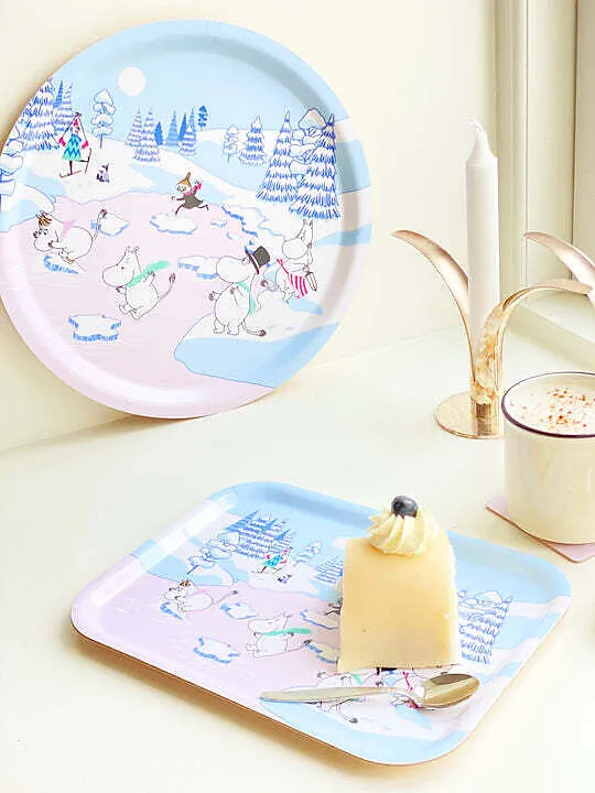 Ein rundes Tablett mit einem Durchmesser von Ø 31 cm, mit einem wunderschönen Motiv, inspiriert von Tove Janssons Originalzeichnungen. Es ist von hoher Qualität und wird in Schweden aus Birkenholz handgefertigt. Spülmaschinenfest. Das Design zeigt die Mumin-Fa...