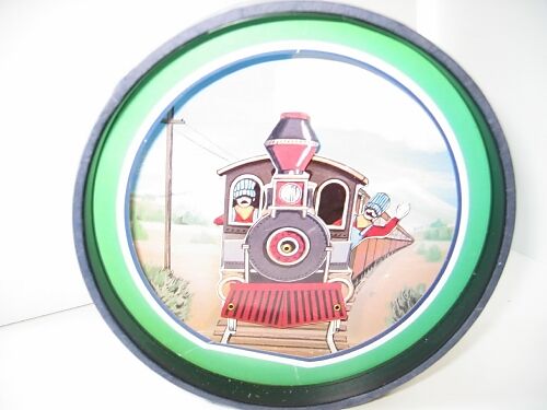 Wirft man ein Geldstück ein, erklingt während ca. 15 Sekunden der berühmte Evergreen "Wochenend und Sonnenschein" und die Lokomotive tanzt dazu. So macht das Sparen doppelt Spass!!! 15 cm Durchmesser,6 cm tief.