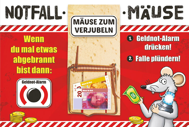 Die Mausefalle ist ein optimales Geldgeschenk. Das Nötli kann in die Mäusefalle eingeklemmt werden. Diese ist auf der Glückwunsch- Doppelkarte angebracht.