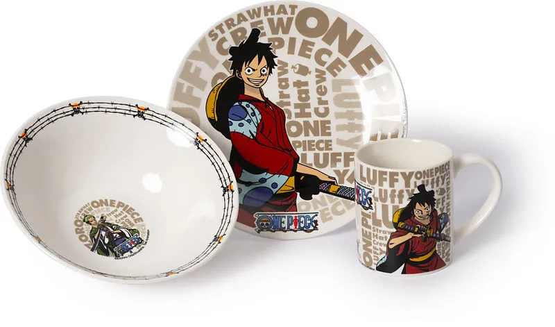 Mit diesem coolen One Piece Set erhältst du alles was du für dein nächstes Frühstück brauchst. In dem Set enthalten sind 1 Schale, 1 Teller und 1 Tasse.