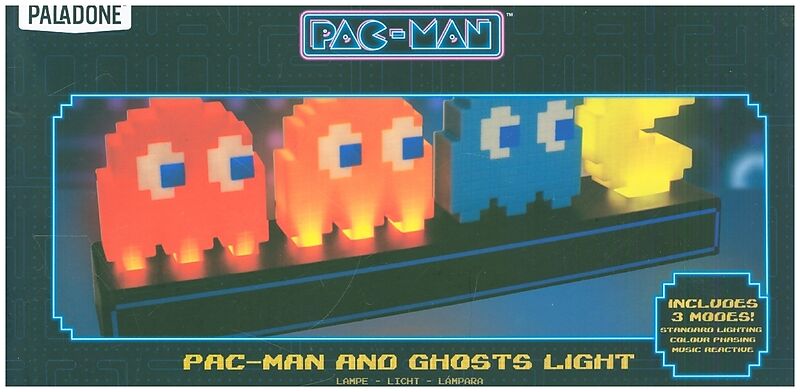 in Geschenkverpackung Design: Offiziell lizenzierter Nintendo Produkt Motiv: Pac-Man mit drei Geistern in rot, orange und blau ca. 6,6 x 31 x 15,2 cm Material: 100 % Kunststoff Details: 3 verschiedene Lichtmodi (Standard / FArbphaseneinstellung / Musik-Reaktiv...