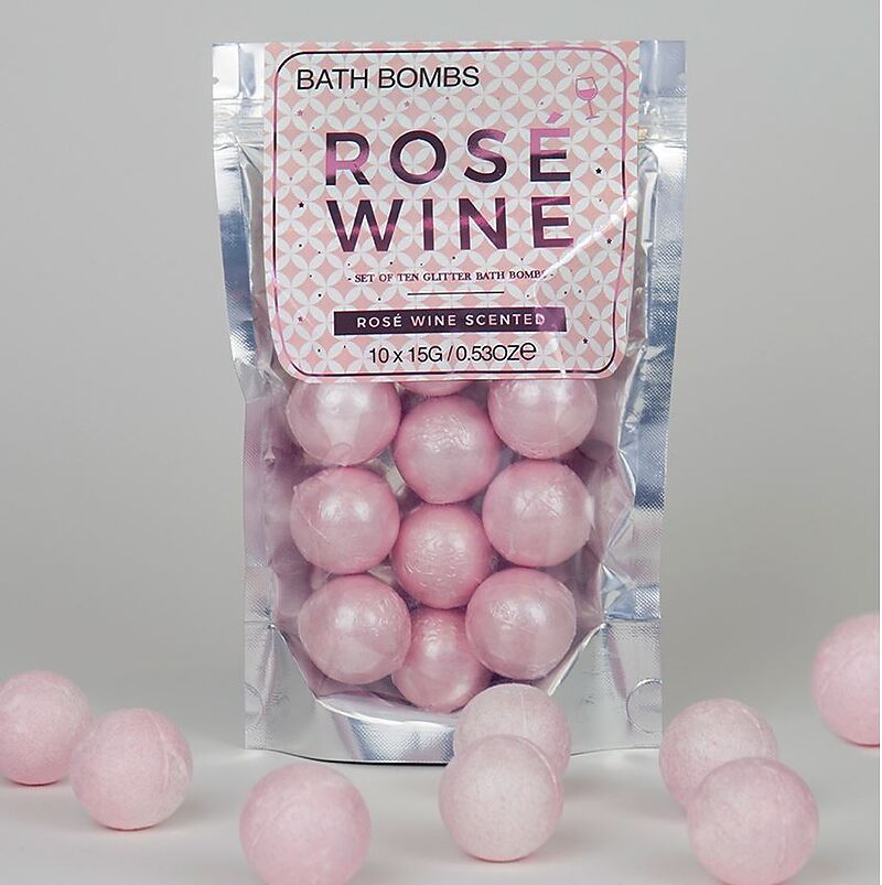 mit leichtem Glittereffekt duftet nach leckerem Rosé Wein 10 einzeln verpackte Badebomben Je Vollbad eine Badebombe Färbt das Wasser, aber nicht die Haut Entspannter kannst du ein Vollbad nicht geniessen.