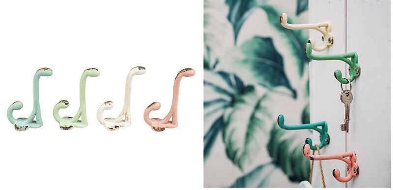 Die Haken sind in verschiedenen Pastellfarben im Vintage-Industriestil erhältlich. Die Haken sind aus Zinn und haben zwei Löcher, durch die sie mit Schrauben an der Wand befestigt werden können.