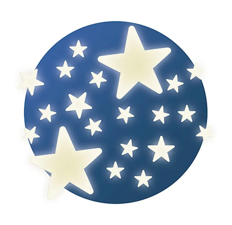 Aus Kunstoff. Doppelseitige Klebefläche aus Schaumstoff. 65 Stück. Die Leuchtdeko speichert am Tag das vorhandene Licht, welches sie dann in der Nacht zum Leuchten bringt.