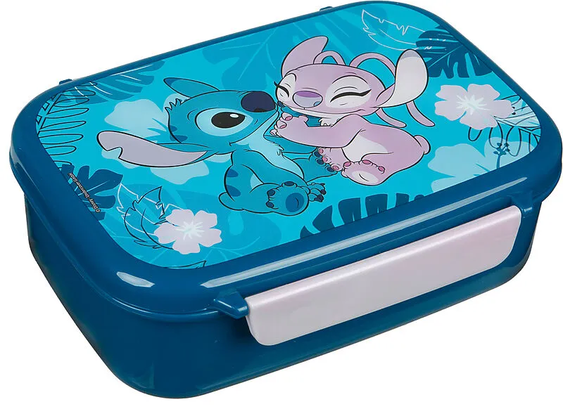 Lunchbox mit Motiv Stitch. Die Lunchbox bietet Platz fürs Znünibrot, Obst oder Gemüse und verschliesst alles sicher durch den Clipverschluss. Masse: 13.5x18x6cm.