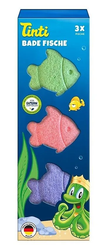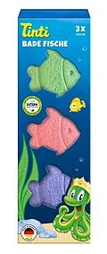 Die drei Bade Fizzer in Form von Fischen färben das Wasser jeweils lila, grün und orange ein und verbreiten dabei einen süßen Brombeerduft. Durch das Sichtfenster in der Verpackung sind die Bade Fische direkt sichtbar. Ohne Mirkoplastik, dermatologisch geteste...