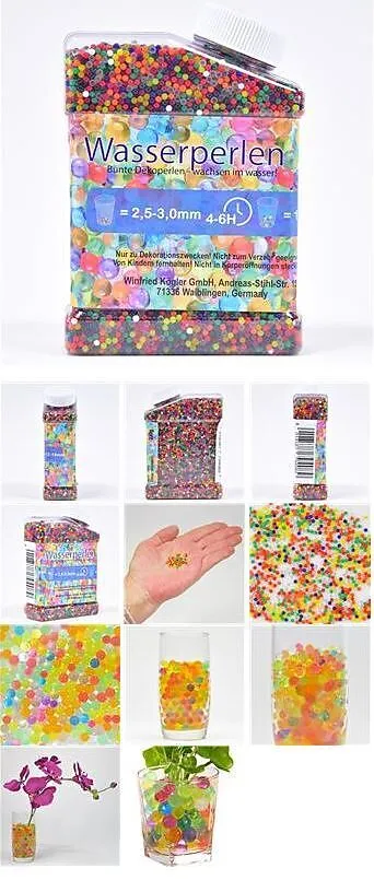 Diese faszinierenden Wasser-Perlen haben eine Größe von ca. 2,5-3mm und sind hart. Legt man sie aber ins Wasser gehen sie in 4-6 Stunden bis zu einer Größe von 12-18mm auf. Dann sind sie elastisch und sind für vieles zu gebrauchen, wie z.B. Dekoration auf Part...