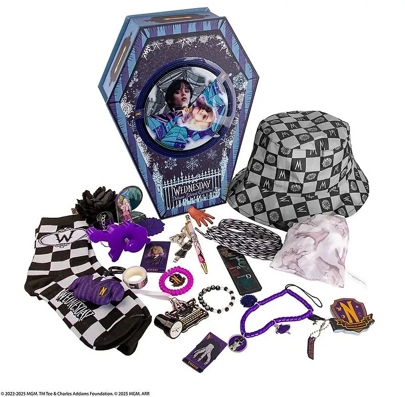 Um alle Geschenke in diesem Kalender zu entdecken, scrollen Sie durch alle Fotos! In seiner einzigartig gestalteten, sargförmigen Box enthält der Wednesday Deluxe Adventskalender 24 hochwertige Geschenke, die von Wednesday Addams inspiriert sind.dunkler Stil. ...