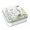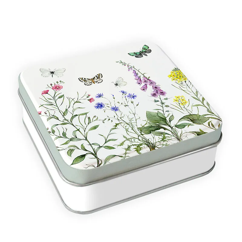 10 x 10 x 3.5 cm aus Blech Schöne Dose die vielseitig einsetzbar ist. Ob als Verpackung für ein kleines Geschenk oder als Aufbewahrung für Krimskrams, sie passt einfach immer.