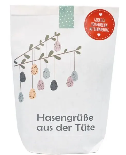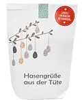 Inhalt: Hasenohrstecker aus Holz Saattüte Zitronenmelisse Raysin Osterhase Holzblüten Inhalt kann variieren. Größe: 14 x 21cm Ostergrüße aus der Tüte Inhalt: - Hasenohrstecker aus Holz - Rucola Wiese Samentüte - 2 Wachteleier Inhalt kann variieren. Größe: 14x2...