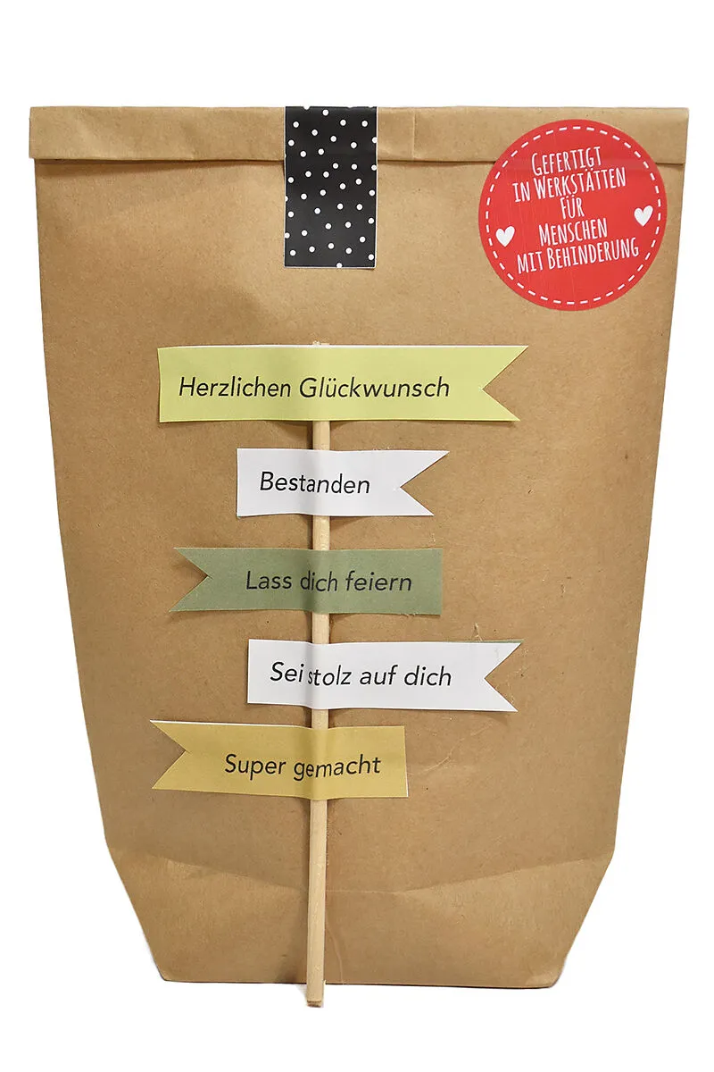 Mit der bestandenen Prüfung geht es für auf zu neuen Horizonten! Das ist ein Grund zum feiern und sich feiern zu lassen. Die liebevoll handgefertigte Wundertüte "Zur bestandenen Prüfung" ist eine herzige Kleinigkeit für den glücklichen Prüfling. Inhalt: Blockk...
