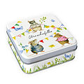 10 x 10 x 3.5 cm aus Blech Schöne Dose die vielseitig einsetzbar ist. Ob als Verpackung für ein kleines Geschenk oder als Aufbewahrung für Krimskrams, sie passt einfach immer.