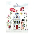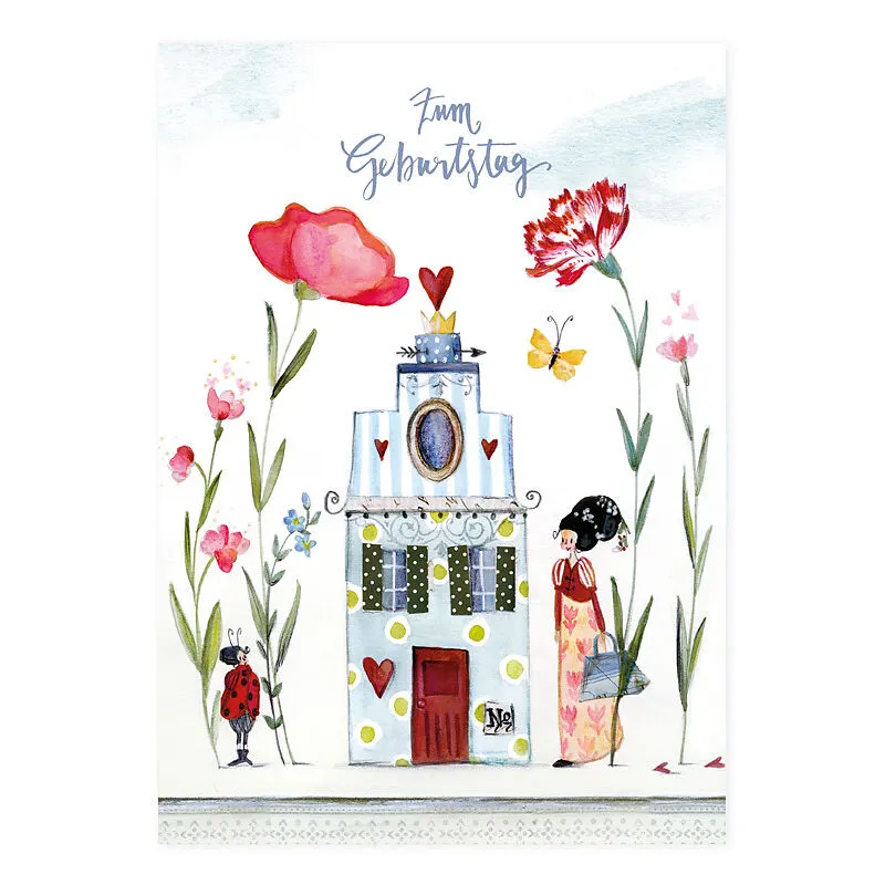Zum Geburtstag Postkarte mit Blumenhaus-Motiv