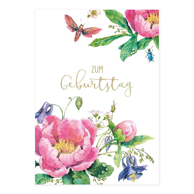 Zum Geburtstag Postkarte mit Pfingstrosen-Motiv