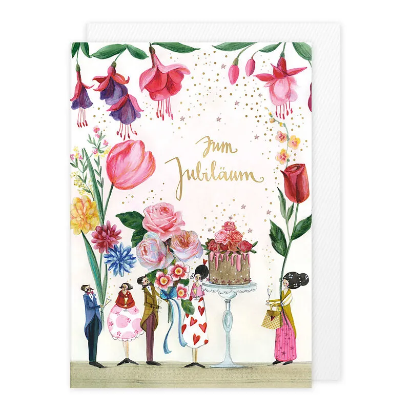 Zum Jubiläum Doppelkarte mit Blumen- und Torten-Motiv
