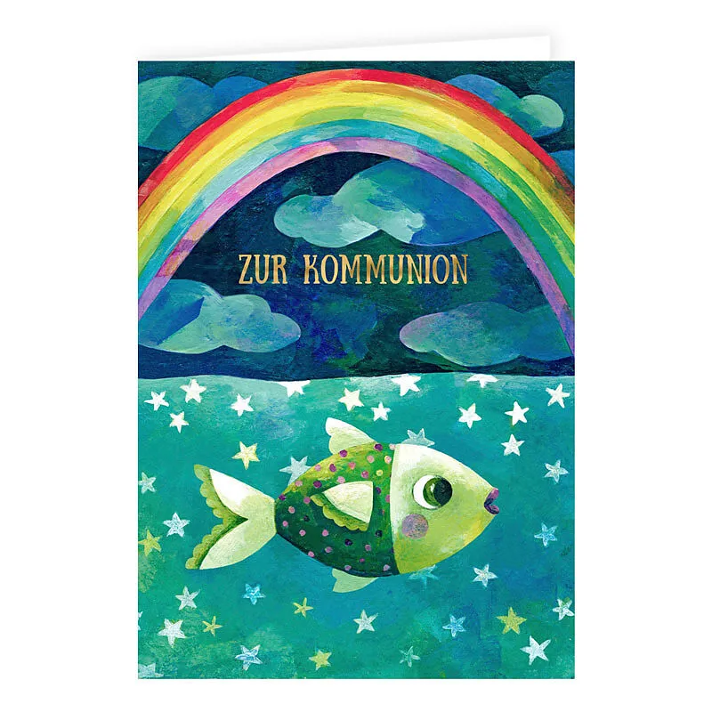 Zur Kommunion Doppelkarte mit Fisch- und Regenbogen-Motiv