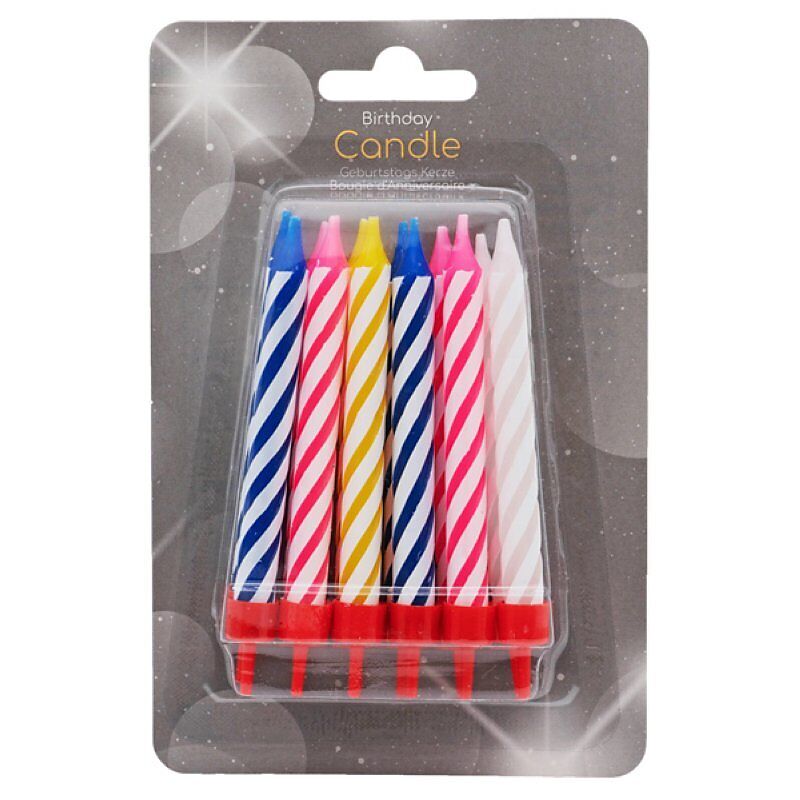 12 Kerzen assortiert in blau, pink, gelb und weiss als Dekoration für auf den Geburtstagskuchen.