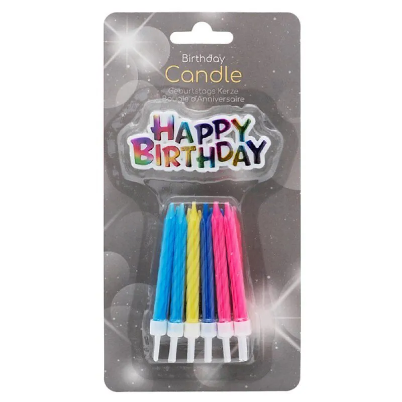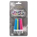 12 Kerzen mit Halter in den Farben pink, violett, gelb und blau für auf den Geburtstagskuchen.