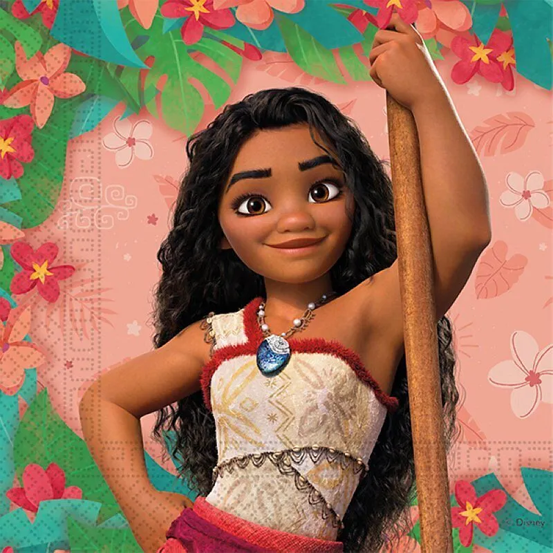 20 Papierservietten 33 x 33 cm mit Motiv aus Disneys Vaiana. Diese bunten Papierservietten sind genau die richtige Dekoration für einen farbenfrohen Kindergeburtstag. Packung à 20 Stück.