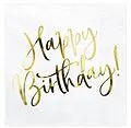 Weisse Papierservietten mit metallisierter Aufschrift Happy Birthday in Roségold, ungefaltet ca. 33 x 33 cm, gefaltet ca. 16,5 x 16,5 cm.