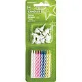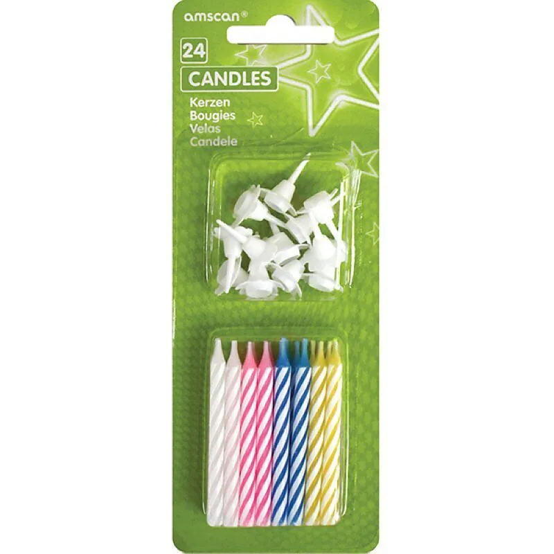 24 Kerzen mit 12 Halter in den Farben pink, weiss, gelb und blau für auf den Geburtstagskuchen.