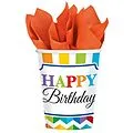 Becher aus Karton 266ml mit Happy Birthday bright. Diese bunten Becher sind genau die richtige Dekoration für einen farbenfrohen Kindergeburtstag. Packung à 8 Becher.