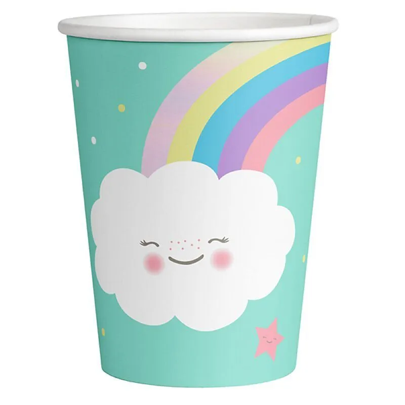 Becher aus Karton 250ml mit Motiv Rainbow & Cloud. Diese bunten Becher sind genau die richtige Dekoration für einen farbenfrohen Kindergeburtstag. Packung à 8 Becher.