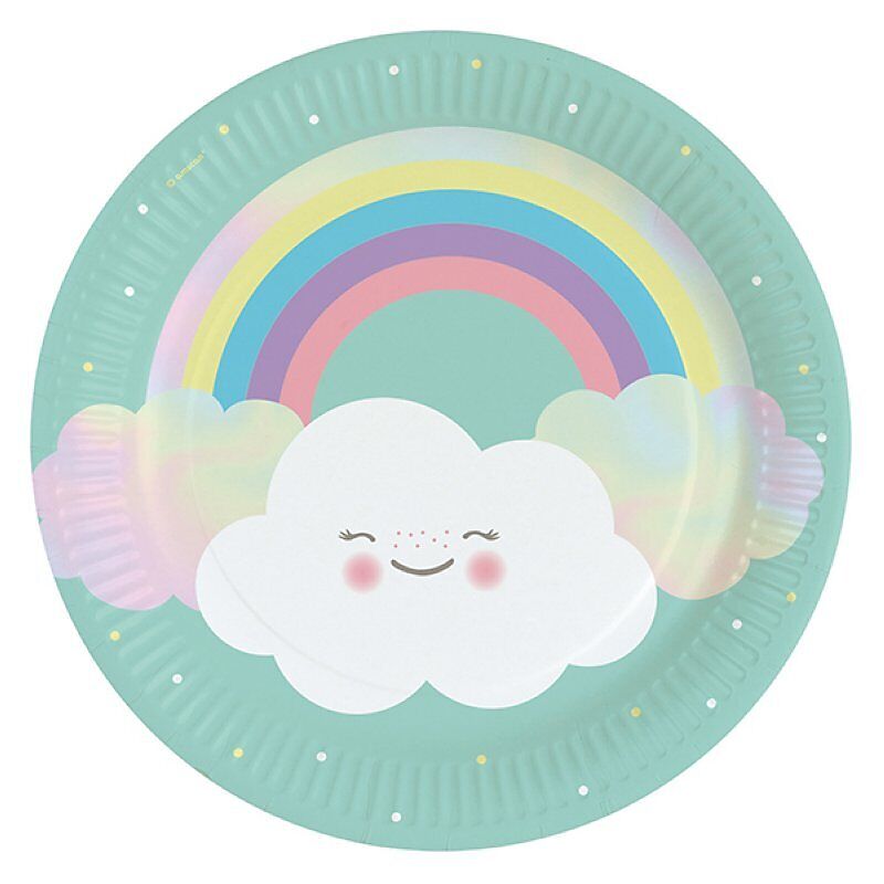 Karton Teller mit Motiv Rainbow & Cloud mit einem Durchmesser von 23 cm. Diese bunte Teller sind genau die richtige Dekoration für einen farbenfrohen Kindergeburtstag. Packung à 8 Teller.