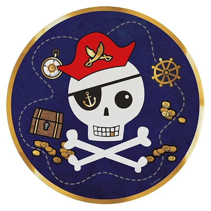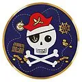 Karton Teller mit Piraten Motiv mit einem Durchmesser von 23 cm. Diese bunte Teller sind genau die richtige Dekoration für einen farbenfrohen Kindergeburtstag. Packung à 8 Teller.