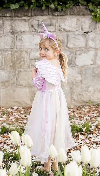 Das ultimative Outfit für kleine Prinzessinnen. Der schillernde Stoff fängt das Licht wie das Horn eines Einhorns ein und erzeugt einen schillernden Regenbogeneffekt, der mit Sicherheit alle Blicke auf sich zieht und Herzen erobert. Lieferumfang: Kleid, Flügel...