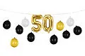 Ballongirlanden 3 in 1 - 50. Geburtstag in Schwarz, Gold und Weiß, Set enthält: Latexballons (10 Stück), Folienballons (2 Stück), Band (25 m) und Papierstroh. Größe nach dem Zusammenbau ca. 260 x 32 cm. Die Girlande hat 3 Montageoptionen, Anleitung enthalten.