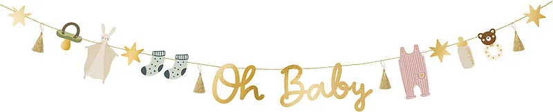 Banner Oh baby, Farbenmix, das Set enthält 13 Papieranhänger (7 Motive und Schriftzug), 4 goldene Quasten und eine goldene Kordel von ca. 2,5 m Länge. Produkt zum Selbstzusammenbau.