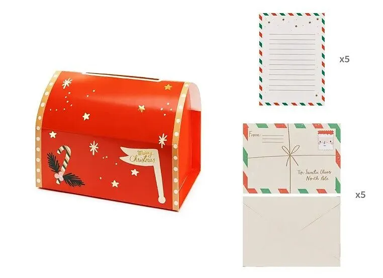 Briefkasten für den Weihnachtsmann, aus Papier. Das Set enthält den Briefkasten, 5 zu beschreibende Briefe und 5 Briefumschläge. Maße im gefalteten Zustand ca. 14 x 22 x 13 cm. Produkt zum Selbstzusammenbau.
