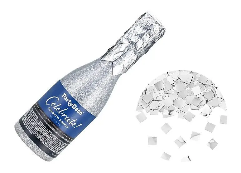Champagnerflaschen-förmige Konfetti-Kanone, die silbernes metallisches Konfetti schießt, Länge ca. 20.5 cm.