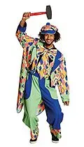 Eine blau-grüne Latzhose für Erwachsene, die mit großes Knöpfen und ge gensätzlichen Taschen versehen ist. Die Hosenbeinenden sind durch ein buntes Karomuster abgesetzt.