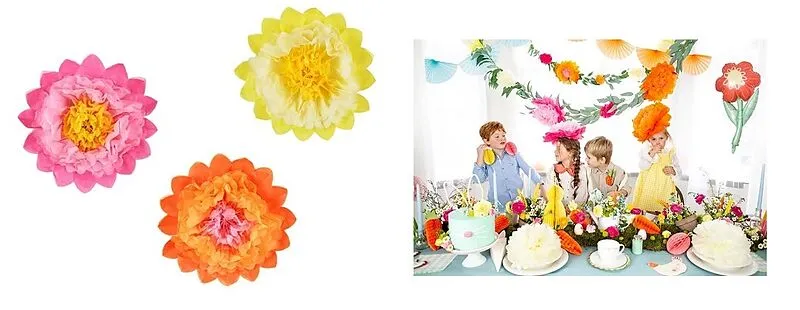 Dekoration aus Seidenpapier Blumen, Farbenmix, Set enthält 3 Teile (1 in jeder Farbe), Größe nach dem Falten ca. 35 cm.